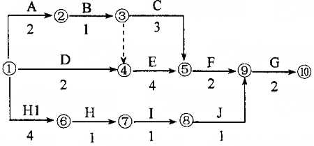 (給分點:H前有4個月的等待時間(HI)并與起點節點相連(1分);箭 線編號從小到大(1分);丁壩工作的緊后工作為G工作(1分);丁壩工作順序為H→I→J(1分)。