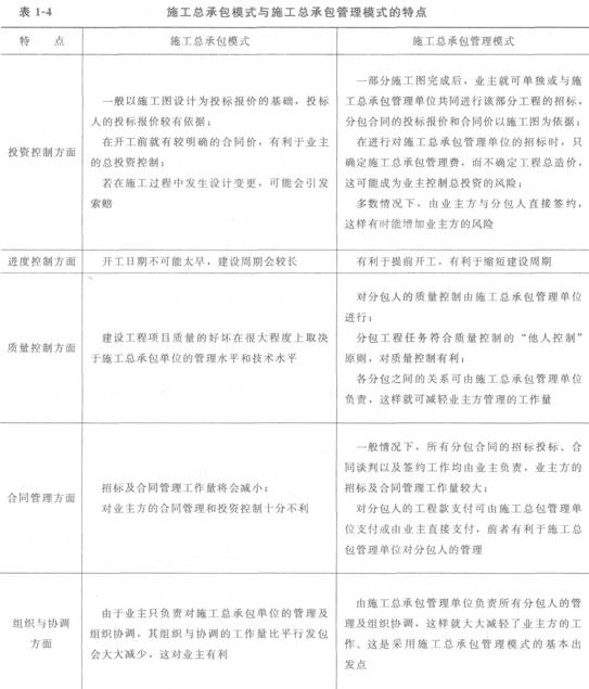 施工總承包模式與施工總承包管理模式的特點見表1―4。