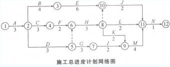 施工總承包單位提交的施工總進度計劃的工期是18個月(1分)。該工程總進度計劃的關鍵線路為①→②→④→⑥→⑧→⑨→⑾→⑿(2分)。