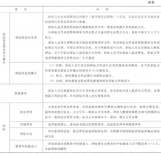 公開招標(biāo);邀請招標(biāo);自行招標(biāo)與委托招標(biāo);招標(biāo)信息的發(fā)布;招標(biāo)信息的修正;資格預(yù)審;初步評審;詳細(xì)評審;評標(biāo)方法;投標(biāo)者須知、合同條款、設(shè)計(jì)圖紙、工廠范圍及工程量表;市場宏觀經(jīng)濟(jì)環(huán)境調(diào)查;現(xiàn)場考察;工程所在地區(qū)的環(huán)境考察;業(yè)主方和競爭對手公司的調(diào)查;復(fù)核工程量;技術(shù)負(fù)責(zé)人主持制定;預(yù)先確定施工方案和施工進(jìn)度;以信譽(yù)取勝、以低價(jià)取勝、以縮短工期取勝、以改進(jìn)設(shè)計(jì)取勝或者以現(xiàn)金或特殊的施工方案取勝;投標(biāo)人在招標(biāo)截止日之前;簽章、密封。
