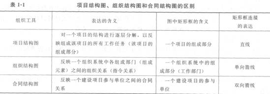 4.項目結構圖、組織結構圖和合同結構圖的區別項目結構圖、組織結構圖和合同結構圖的區別見表1―1。