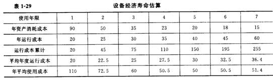 【答案】B本題考核的是設(shè)備經(jīng)濟(jì)壽命的估算。設(shè)備從開始使用到其年平均使用成本最小(或年盈利最高)的使用年限N。為設(shè)備的經(jīng)濟(jì)壽命。具體計算方法見表1-29。根據(jù)下表可以得到設(shè)備經(jīng)濟(jì)壽命為5年。