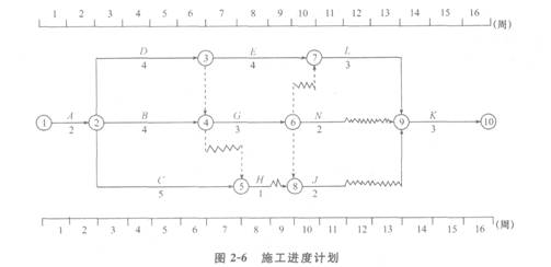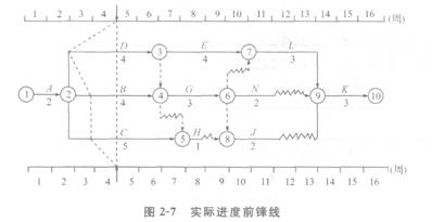 1.根據第4周末的檢查結果,實際進度前鋒線如圖2―7所示。