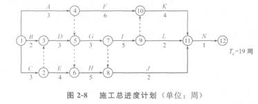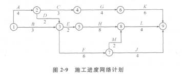 某綜合樓工程,地下1層,地上10層,鋼筋混凝土框架結構,建筑面積28500m2。某施工單位與建設單位簽訂了工程施工合同,合同工期約定為20個月。施工單位根據合同工期編制了該工程項目的施工進度計劃,并且繪制出施工進度網絡計劃如圖2-9所示(單位:目)