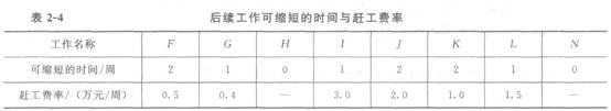 事件2:A、D工作完成后,建設單位擬將后續工程的總工期縮短2周,要求項目監理機構幫助擬定一個合理的趕工方案,以便與施工單位洽商,項目監理機構提出的后續工作可以縮短的時間及其趕工費率見表2―4。