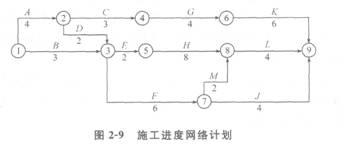 某綜合樓工程,地下1層,地上10層,鋼筋混凝土框架結構,建筑面積28500m2。某施工單位與建設單位簽訂了工程施工合同,合同工期約定為20個月。施工單位根據合同工期編制了該工程項目的施工進度計劃,并且繪制出施工進度網絡計劃如圖2-9所示(單位:月)。