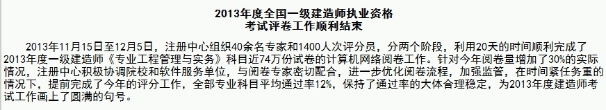 【摘要】環球網校一級建造師考試頻道,為方便各位一級建造師考生更好的查詢考試資訊,特地整理一級建造師考試考點相關新聞,本文為《2013年一級建造師的通過率是多少?》,更多資料及試題敬請關注環球網校一級建造師考試頻道或【ctrl鍵+D】手動收藏此頁面。