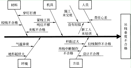 2.因果分析圖法也是從“人員、機具、材料、方法、環境”五個方面著手分析,但此處分析的對象有所不同,是針對影響吊線垂度質量的因素。參考答案見下圖。