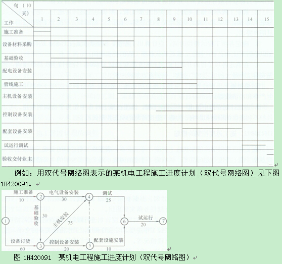 例如:用橫道圖表示的某機電工程施工進度計劃表見表1H42009J。