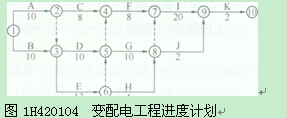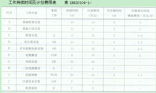 安裝公司項目部進場后,依據(jù)合同、施工圖、驗收規(guī)范及總承包的進度計劃,編制了變配電工程的施工方案、進度計劃(見圖1H420104)、勞動力計劃和計劃費用。項目部施工準備工作用去了5d。當正式施工時,因商場需提前送電,業(yè)主要求變配電工程提前5d竣工。項目部按工作持續(xù)時間及計劃費用(見表1H420104-1)分析,在關(guān)鍵工作上,以最小的趕工增加費用,在試驗調(diào)整工作前趕出5d。