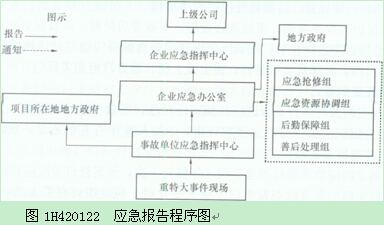 (1)一旦發(fā)生事故,事故所在項目部在啟動本項目部應(yīng)急預(yù)案的同時,應(yīng)立即按應(yīng)急報告程序的要求向企業(yè)應(yīng)急指揮中心辦公室上報,應(yīng)急報告程序參見圖1H420122,報告以書面及事故快報方式,報告時間最多不超過lh(境外事件最多不超過8h)。