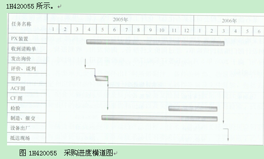 某石油化工工程公司對(duì)某石化總廠化纖工程中的PX(對(duì)二甲苯)裝置實(shí)施設(shè)計(jì)、采溝、施工總承包。該工程施工進(jìn)度要求PX裝置必須于2006年3月24日抵達(dá)施工現(xiàn)場(chǎng)。頁目采購部編制了裝置采購詳細(xì)進(jìn)度計(jì)劃,見表1H4200550采購部于2005年4月15日接到設(shè)計(jì)部門編制的請(qǐng)購單,經(jīng)過詢價(jià)文件準(zhǔn)備、詢價(jià)發(fā)出、收到報(bào)價(jià)、完成報(bào)價(jià)評(píng)審表后與廠商于2005年5月26日簽訂采購訂單。檢驗(yàn)需要用104d時(shí)間,制造和催交需要用289d時(shí)間。