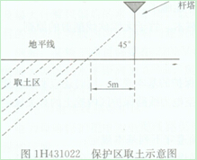 (2)取土坡度規定。經縣以上電力主管部門批準,在電力設施保護區內允許取土的范圍內取土時,應規定一個最佳取土坡度,即取土后所形成的坡面與地平線之間的夾角,一般不得大于4 5 0 0如圖1H431022所示: