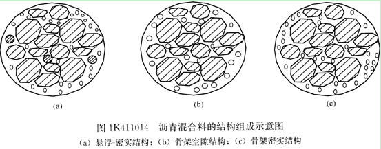 三種結構的瀝青混合料由于密度ρ、空隙率VV、礦料間隙率VMA不同,使它們在穩(wěn)定性和路用性能上亦有顯著差別。它們的典型結構組成示意圖見圖1K411014。