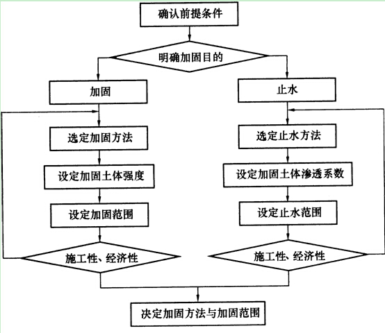 洞口土體加固前,要根據地質條件、地下水位、盾構種類與外形尺寸、覆土深度及施工環境條件等,在明確加固目的后,按照圖1K413033所示程序確定加固方案。