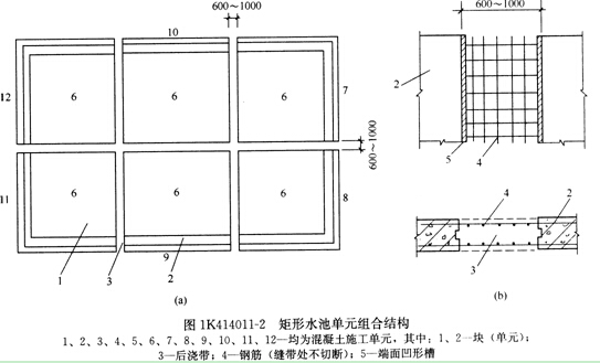 (2)以圓形儲(chǔ)水池為例,池體通常由若干塊厚扇形底板單元和若干塊倒T型壁板單元組成,一般不設(shè)頂板。單元一次性澆筑而成,底板單元間用聚氯乙烯膠泥嵌縫,壁板單元間用橡膠止水帶接縫,如圖lK414011-1所示。這種單元組合結(jié)構(gòu)可有效防止池體出現(xiàn)裂縫滲漏。
