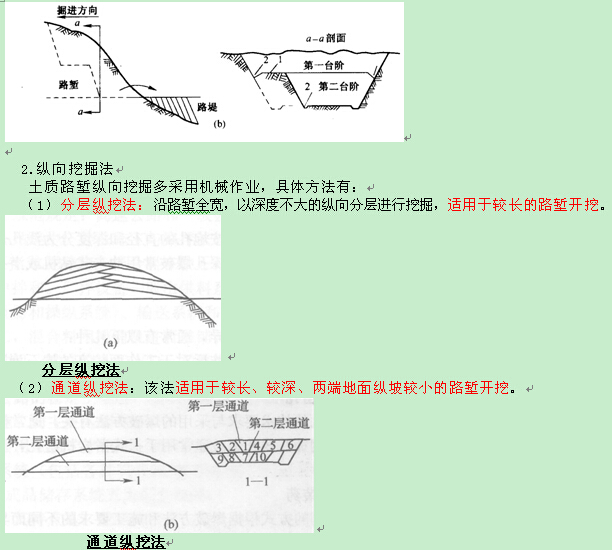 (2)多層橫向全寬挖掘法:從開(kāi)挖路塹的一端或兩端按斷面分層挖到設(shè)計(jì)標(biāo)高,適用于挖掘深且短的路塹。