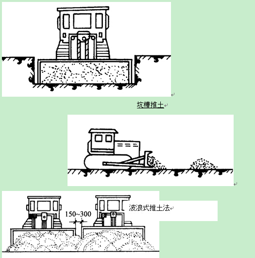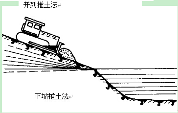 推土機開挖土方作業(yè)由切土、運土、卸土、倒退(或折返)、空回等過程組成一個循環(huán)。影響作業(yè)效率的主要因素是切土和運土兩個環(huán)節(jié)。其作業(yè)方式一般有:坑槽形推土法、波浪式推土法、并列推土法、下坡推土法、接力推土法。