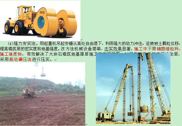 (3)沖擊壓實法:利用沖擊壓實機的沖擊碾周期性大振幅低頻率地對路基填料進行沖擊,壓密填方。它具有分層法連續(xù)性的優(yōu)點,又具有強力夯實法壓實厚度深的優(yōu)點。缺點是在周圍有建筑物時,使用受到限制。