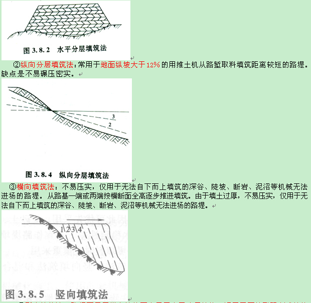 (3)填筑路堤宜采用水平分層填筑法施工。如原地面不平,應由最低處分層填起,每填一層,經過壓實符合規(guī)定要求之后,再填上一層。