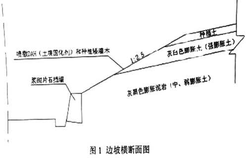 某高速公路膨脹土路塹段,長480m,挖深8~9m,右側為順層邊坡,巖土層傾角為12~15o,結構面內摩擦角為5o,粘聚力為12Kpa。邊坡加固防護方案如圖1所示。