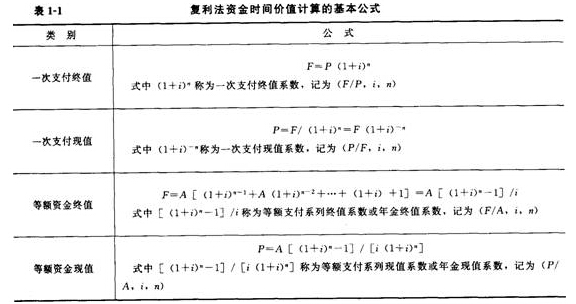 復(fù)利法資金時(shí)間價(jià)值計(jì)算的基本公式見表1-1。