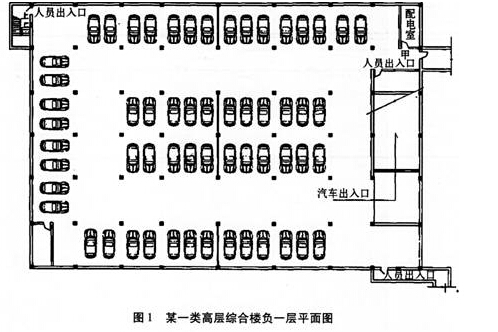21、某一類高層綜合樓,地下一層為汽車庫(kù)和設(shè)備用房,車庫(kù)部分建筑面積約為5900m2,可停放車輛約170輛,車庫(kù)高度為4.8m,圖1為其平面圖(見(jiàn)下頁(yè)圖),請(qǐng)分析