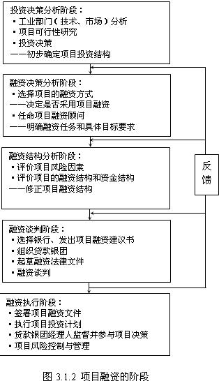 從項目的投資決策至選擇項目融資方式,最后到完成項目融資為止,項目融資大致可分為5個階段,即投資決策分析、融資決策分析、融資結構分析、融資談判和項目融資的執行(如圖3.1.2所示)。
