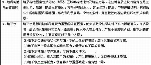 分析:影響邊坡穩定性的因素有內在因素與外在因素兩個方面。內在因素有組成邊坡巖土體的性質、地質構造、巖體結構、地應力等,它們常常起著主要的控制作用;外在因素有地表水和 地下水的作用地震、風化作用、人工挖掘、爆破以及工程荷載等。