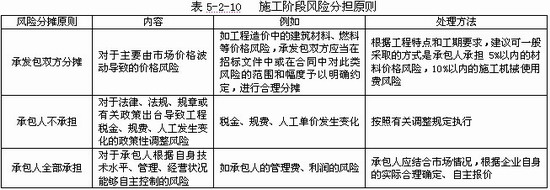 根據國際慣例并結合我國社會主義市場經濟條件下工程建設的特點,承發包雙方對工程施工階段的風險宜采用如表5-2-10所示的原則分攤。