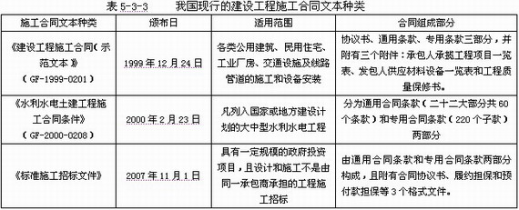 目前,在工程建設中比較典型的施工合同文本主要有:建設工程施工合同示范文本、水利水電土建工程施工合同條件以及《標準施工招標文件》的合同條款。主要內容見表5-3-3。