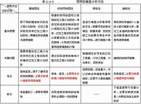 常用的偏差分析方法有橫道圖法、時(shí)標(biāo)網(wǎng)絡(luò)圖法、表格法和曲線法。見表6-4-5