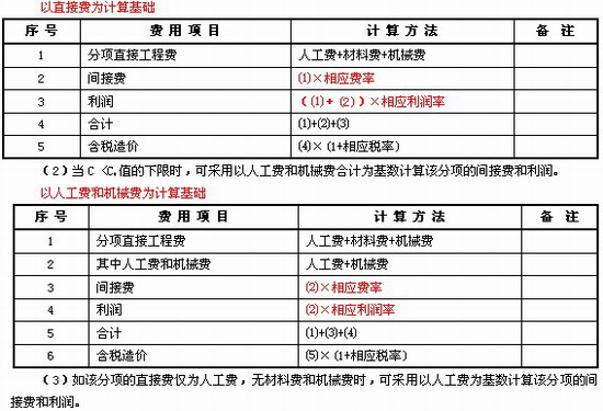 (1)當C >C0(C0為本地區(qū)原費用定額測算所選典型工程材料費占人工費、材料費、和機械費合計的比例)時,可采用以人工費、材料費、機械費合計為基數(shù)計算該分項的間接費和利潤。