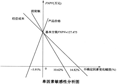 從圖示可知,其中每一條斜線的斜率反映經濟評價指標對該不確定因素的敏感程度,斜率越大敏感度越高。一張圖可以同時反映多個因素的敏感性分析結果。每條斜線與橫軸的相交點所對應的不確定因素變化率即為該因素的臨界點。