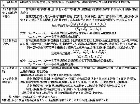 材料價格是指材料(包括構件、成品及半成品等)從其來源地(或交貨地點、供應者倉庫提貨地點)到達施工工地倉庫(施工地點內存放材料的地點)后出庫的綜合平均價格。材料價格一般由材料原價(或供應價格)、材料運雜費、運輸損耗費、采購及保管費組成。上述四項構成材料基價,此外在計價時,材料費中還應包括單獨列項計算的檢驗試驗費。