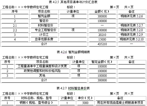 1)暫列金額應按照其他項目清單中列出的金額填寫,不得變動(如表4.2.6所示)。