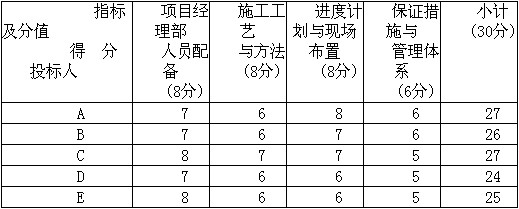 (1)技術標為30分,其中:項目經(jīng)理部人員配備8分、施工工藝與方法8分、進度計劃與現(xiàn)場布置8分、保證措施與管理體系6分。各投標人技術標得分見下表。