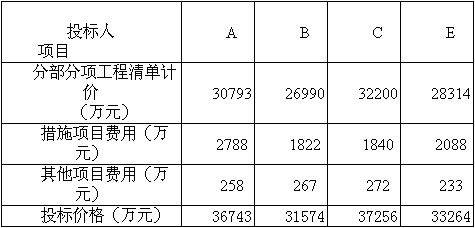 (3)確定標底為34709萬元,有效投標區(qū)間為31238萬元~38180萬元。