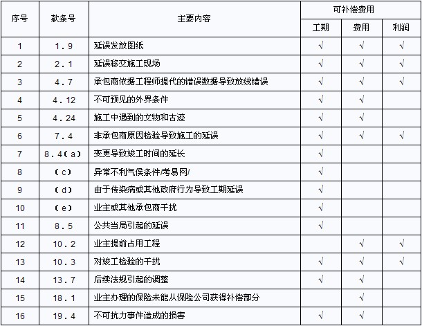 1.索賠費(fèi)用內(nèi)容包括:人工費(fèi);設(shè)備費(fèi);材料費(fèi);保函手續(xù)費(fèi);貸款利息;保險(xiǎn)費(fèi);管理費(fèi);利潤;