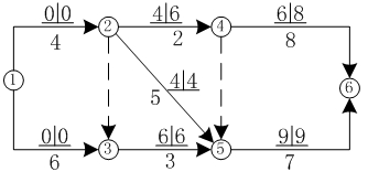 【試題解析】工作1-3的自有時差=6-(0+6)=0;工作2-4的自有時差=6-(4+2)=0;工作2-5總時差=4-4=0,所以是關鍵工作;工作3-5的總時差=6-6=0;工作4-6的總時差=8-6=2。