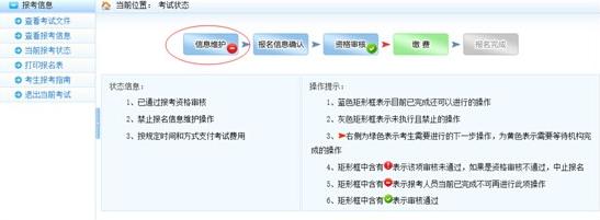 報考人員在報名信息確認前可以修改報名信息,在考試狀態流程圖點擊“信息維護”進行修改操作。如果報名信息已經確認,報考人員不可自行修改報名信息。