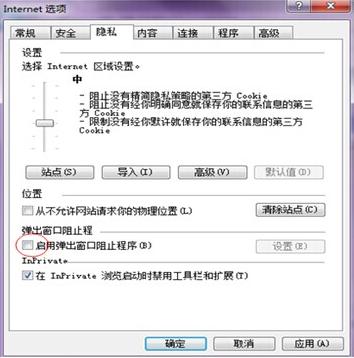 IE瀏覽器菜單欄――》工具選項(xiàng)下“Internet選項(xiàng)”――》隱私選項(xiàng)卡中將倒數(shù)第二個(gè)復(fù)選框“啟用彈出窗口阻止程序”取消勾選,最后點(diǎn)擊【確定】。效果如下圖:
