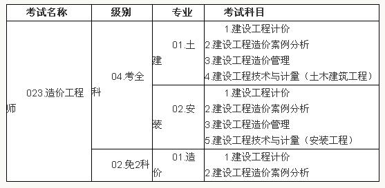 造價工程師執(zhí)業(yè)資格考試設(shè):《建設(shè)工程造價管理》、《建設(shè)工程計價》、《建設(shè)工程技術(shù)與計量》(本科目分“土木建筑工程”與“安裝工程”2個子專業(yè),考生可根據(jù)工作實際選報其一)、《建設(shè)工程造價案例分析》4個科目。