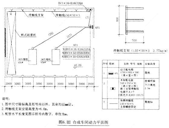 3.木制配電板引至滑觸線的管、線與其電源管、線相同,其至滑觸線處管口標高為+6m,導線出管口后的預留長度為1m.