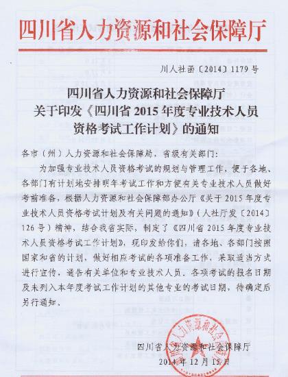 現將四川省人力資源和社會保障廳《關于印發〈四川省2015年度專業技術人員資格考試工作計劃〉的通知》(川人社函〔2014〕1179號)轉發你們,請按照國家和省的計劃,做好相應考試的各項準備工作,采取適當方式進行宣傳,通告有關單位和專業技術人員。