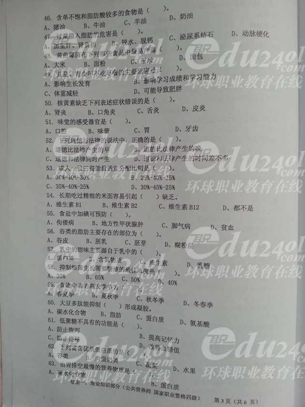 河北省2012年11月公共營養師四級理論知識考試真題