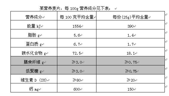⑴ 營養成分表:指標有食品營養成分名稱和含量的表格,本產品每100g平均含量:能量1554kJ、脂肪5.6g、蛋白質6.7g、碳水化合物72.5g、膳食纖維≥3.0g、低聚糖≥3.0g、9種維生素、6種礦物質。同時標注每份(25g)的能量及營養素平均含量。
