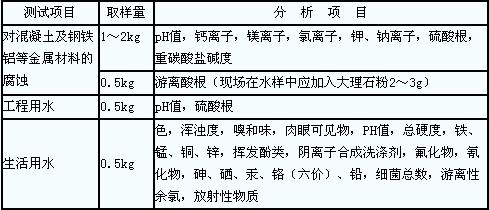測試目的和內容見下表。對于污染水的取樣量及分析項目應根據污染物質確定。