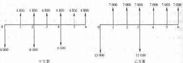 解 (1)用最小公倍數法。假設方案可以完全重復,最小公倍數法的現金流量圖如下:由圖可知NPV甲=-6000×[1+(P/F,10%,2)+(P/F,10%,4)]+4 800×(P/A,10%,6)