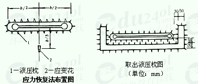 測點布置及應變量測儀及應變片同(表面)應力解除法。應力恢復設備包括液壓枕、油泵及壓力表等。液壓枕與應變片的布置見下圖。